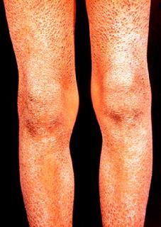 鱼鳞病是一种以皮肤干燥伴有鱼鳞状鳞屑为特征的遗传性皮肤病。由于遗传方式、形态学和组织学上的不同,本病临床有多种分型,其中最常见的、多发的是寻常型鱼鳞病,其主要临床特点是:出生时皮肤外观正常,出生数月后发病,此后随年龄的增长病情逐渐加重,皮肤干燥,皮面出现细薄的片状鳞屑,皮损以四肢伸侧为重尤以小腿明显,同时伴有掌跖角化增厚,手背、上臂、股外侧皮肤增厚,有时还伴有甲变脆、毛发稀疏等。一般患者在1~4岁时症状已经较明显。皮损在冬季寒冷干燥季节加重,在潮湿温暖的夏季减轻。部分患者成年后皮损可逐渐减轻。患者常有家族遗传史,自幼发病持续终生。中医称为“蛇身”、“蛇皮”,民间旧称“鱼鳞癣”。